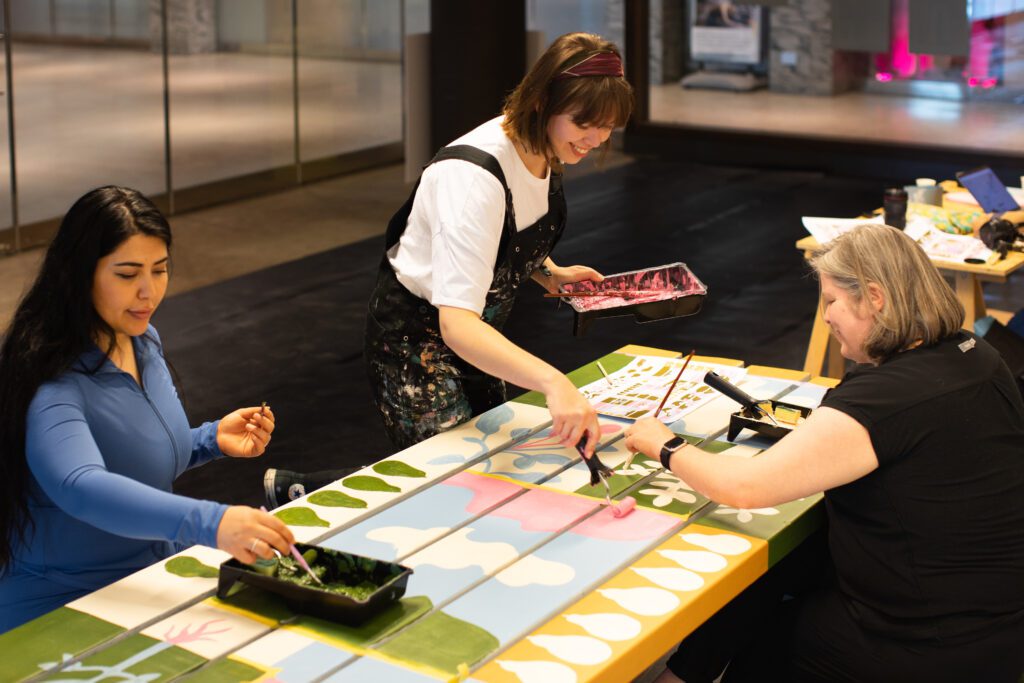 Afgelopen maanden kon het publiek de kunstenaars aan het werk zien in een tijdelijke atelierruimte in de stationshal. Tafel voor tafel verschenen er verhalen, kleuren, symboliek en lagen. De schilderingen zijn geïnspireerd op de beleving van wachten binnen de context van maatschappelijke thema’s als integratie, inclusie en kansengelijkheid.